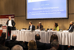 Eröffnet wurden die Berliner Energietage am 4. Mai mit einer Debatte zum Klimaschutz-Sofortprogramm: Das Maßnahmenpaket der Bundesregierung für mehr Tempo beim Erreichen der Klimaschutz-Ziele. Knapp 250 Zuschauer*innen verfolgten die Veranstaltung live im Ludwig-Erhard-Haus, rund 500 Personen waren digital zugeschaltet. Neben Tanja Loitz von co2online nahmen Friedrich Seefeldt vom Wirtschaftsforschungsunternehmen Prognos und Christian Noll von der Deutschen Unternehmensinitiative Energieeffizienz (DENEFF) auf dem Podium Platz.